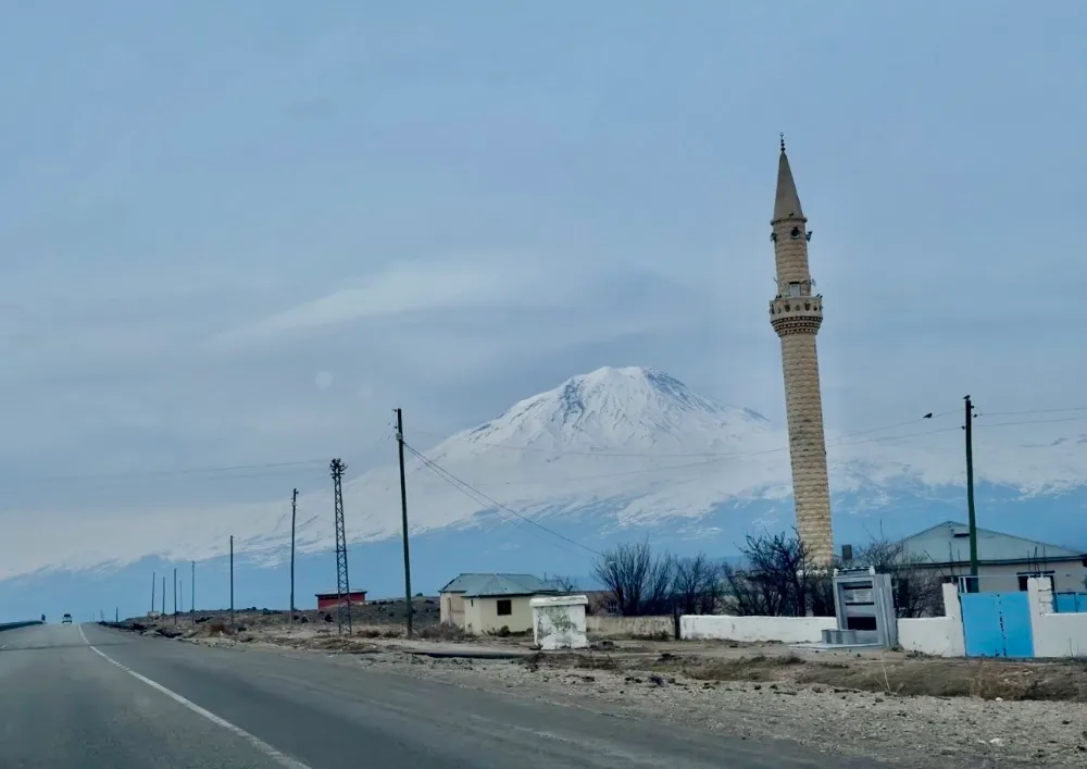 Yol boyunca sürücülere manzarasıyla eşlik eden Ağrı Dağı, bölgedeki tepelerin arasında ihtişamıyla yükseliyor.