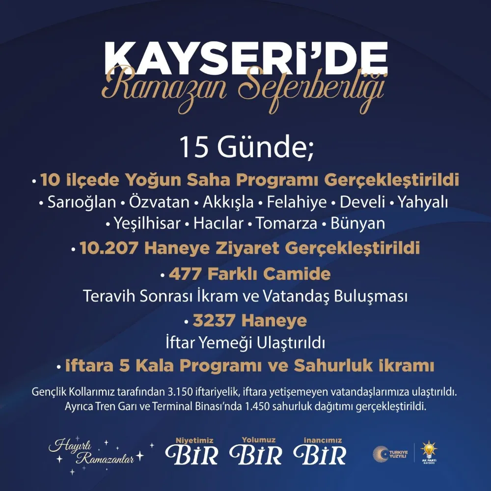 AK Parti Kayseri İl Başkanlığı tarafından çalışmalarla ilgili yapılan açıklamada, "15 günde Sarıoğlan, Özvatan, Akkışla, Felahiye, Develi, Yahyalı, Yeşilhisar, Hacılar, Tomarza ve Bünyan’da gönül gönüleydik. 10 ilçede yoğun saha programı gerçekleştirdik. 10 bin 207 haneye misafir olduk. 477 farklı camide teravih sonrası hemşehrilerimizle buluştuk. 3 bin 237 haneye iftar yemeği ulaştırdık. İftara 5 Kala Programı ve Sahurluk İkramı programlarında Gençlik Kollarımız tarafından 3 bin 150 iftariyelik, iftara yetişemeyen vatandaşlarımıza ulaştırıldı. Ayrıca Tren Garı ve Terminal Binası’nda bin 450 sahurluk dağıtımı gerçekleştirildi. Bu mübarek ayın bereketini, dayanışmasını ve kardeşliğini Kayseri’nin dört bir yanında paylaşmaya devam ediyoruz" ifadelerine yer verildi.
