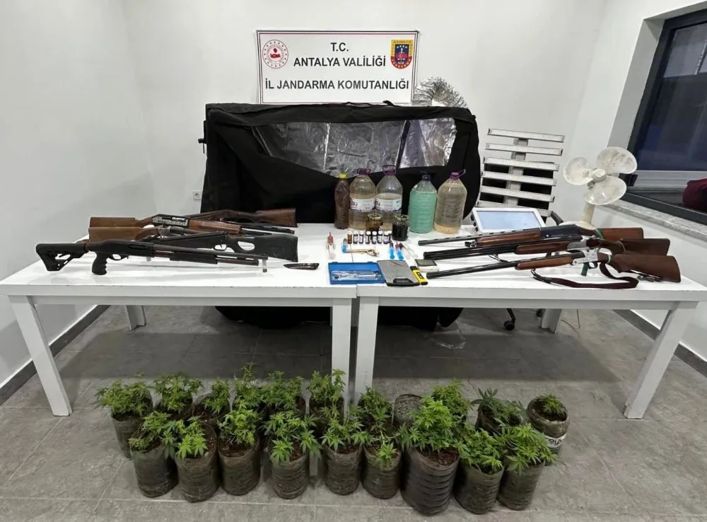 Edinilen bilgiye göre, Antalya İl Jandarma Komutanlığı tarafından yürütülen çalışmalar çerçevesinde, Alanya Cumhuriyet Başsavcılığı'nın talimatları doğrultusunda Alanya ilçesinde uyuşturucuyla mücadele kapsamında 2 şüphelinin ev ve eklentilerinde arama yapıldı. Yapılan aramalarda, 17 litre sıvı metamfetamin (işlenmeye ve satışa hazır halde), 19 kök kenevir bitkisi (özel düzenekle yetiştirildiği değerlendirilen), kenevir yetiştirmek amacıyla kurulan 2 adet iklimlendirme ünitesi ve yetiştirme çadırı, ortam hava sirkülasyonunu sağlamak için kullanılan 1 adet havalandırma sistemi, uyuşturucu üretiminde değerlendirildiği tespit edilen 8 farklı kimyasal madde, hassas gramaj ölçümünde kullanılan 1 adet hassas terazi ve 8 adet ruhsatsız av tüfeği ele geçirildi.