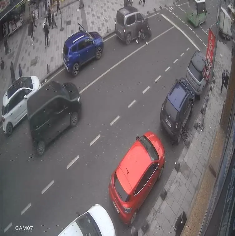 Kaza anı ve yaşanan kovalamaca çevrede bulunan bir iş yerinin güvenlik kamerası tarafından kaydedildi. Görüntülerde motosikletlinin ön kaldırdığı, park halindeki araca çarptığı, yolcunun yere düştüğü ve ardından motosikletlinin kaçtığı anlar net şekilde görüldü.