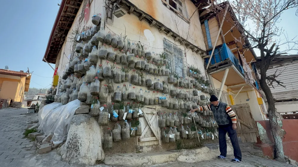 Tokat’ta Selahattin Demirkan, plastik su bidonlarını saksıya çevirerek evinin duvarında yeşil soğan yetiştiriyor.