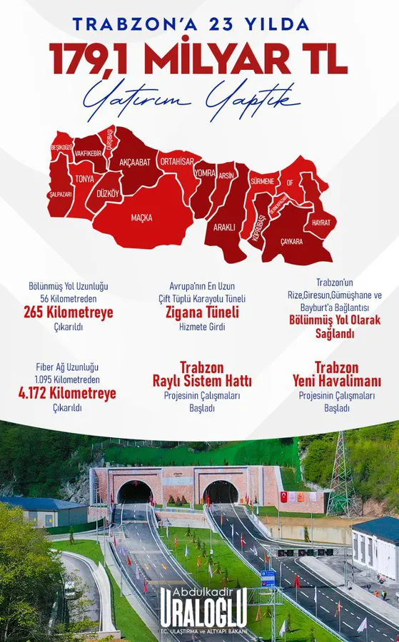 Son 23 yılda Trabzon’da gerçekleştirilen yatırımlar, kentin ulaşım ve iletişim altyapısında büyük bir dönüşümü beraberinde getirdi. Bakanlığın verilerine göre bölünmüş yol uzunluğu 56 kilometreden 265 kilometreye çıkarılırken, Zigana Tüneli Avrupa’nın en uzun çift tüplü karayolu tüneli olarak özellikle kış aylarında kesintisiz ulaşımı sağlıyor.