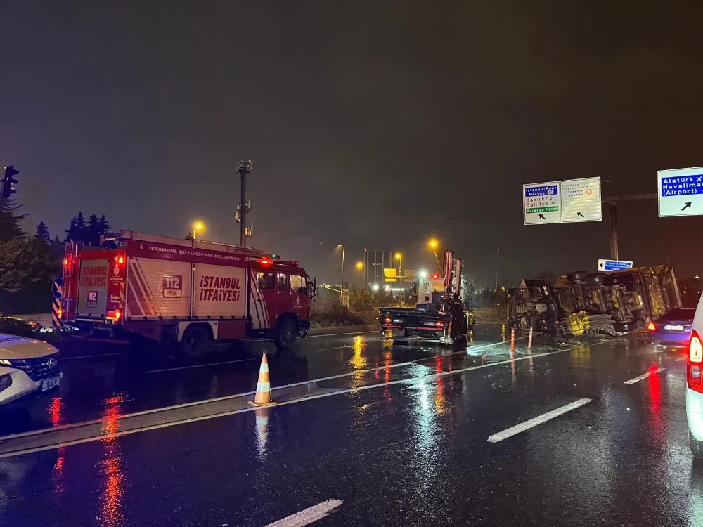 İstanbul Bakırköy'de kayganlaşan yolda sürücüsünün kontrolünden çıkan hafriyat kamyonu, bariyere çarparak devrildi. Kazaya yardım etmek için otomobilinden inen sürücüye, arkadan gelen başka bir otomobil çarptı. Kazada yaralanan iki kişi hastaneye kaldırıldı.