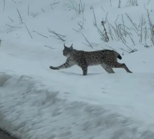 Karlı arazide görülen vaşak, yolun karşısına geçmeye çalıştığı sırada o güzergahtan aracıyla ilerleyen Vedat Özeler’in dikkatini çekti. Vaşağı cep telefonu kamerasıyla kayda alan Özeler'in görüntülerinde, iri cüsseli vaşağın yolun karşı tarafına geçtiği görülüyor.