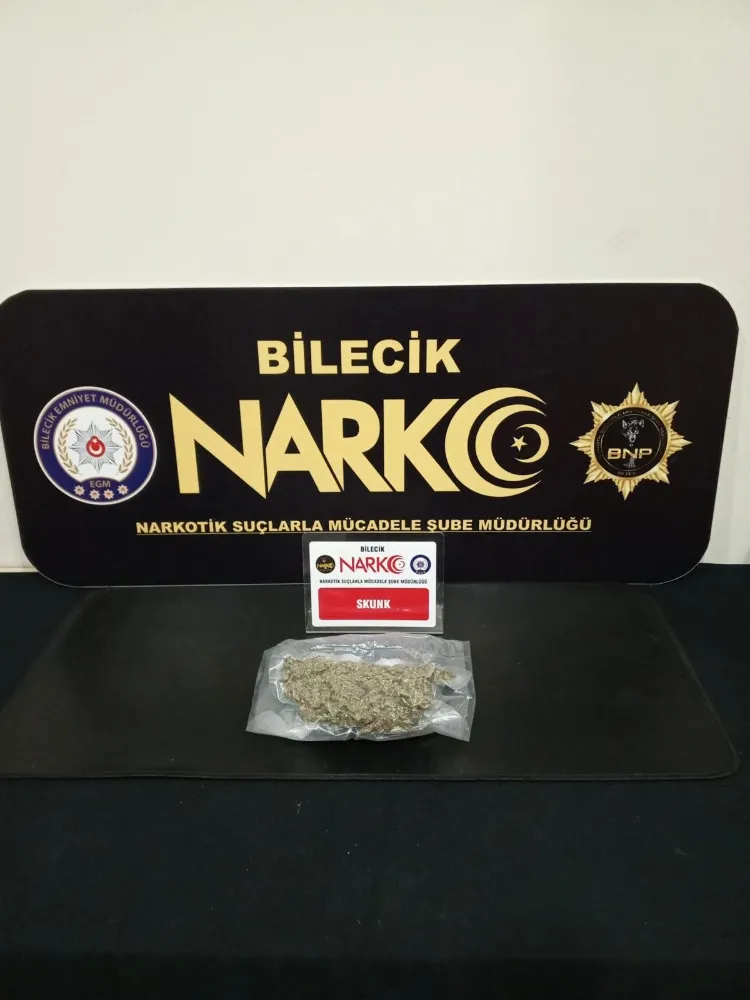 Alınan bilgilere göre; Bilecik İl Emniyet Müdürlüğüne bağlı Narkotik Suçlarla Mücadele Şube Müdürlüğünce yapılan yol kontrollerinde bir sürücünün şüpheli hareketleri sonrası hemen harekete geçti. Narkotik köpeği araçta yaptığı aramada bagaj kısmına geldiğinde o bölüme yoğunlaştı. Açılan bagajda çadır içine saklanmış 220,52 gram 'Skunk' maddesi ele geçirildi. Araçta bulunan 2 kişi gözaltına alınırken, ilk sorguların ardından adliyeye sevk edildi. 1 şahıs mahkemece adli kontrol şartıyla, 1 şahıs savcılık işlemleri akabinde serbest bırakıldı.