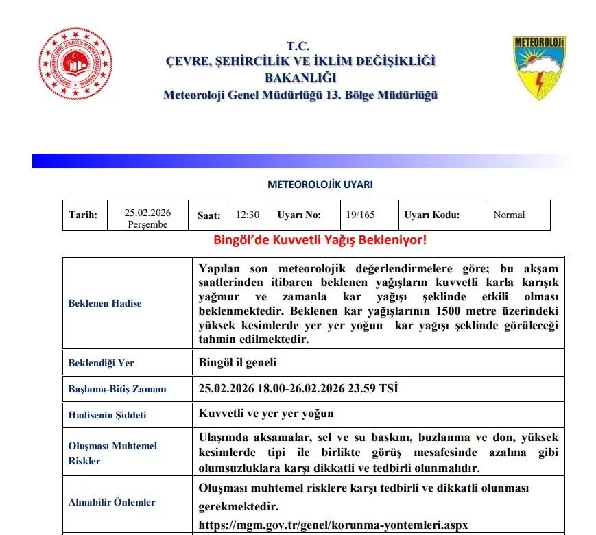 Meteoroloji 13. Bölge Müdürlüğü’nden yapılan açıklamada, "Yapılan son meteorolojik değerlendirmelere göre; bu akşam saatlerinden itibaren beklenen yağışların kuvvetli karla karışık yağmur ve zamanla kar yağışı şeklinde etkili olması beklenmektedir. Beklenen kar yağışlarının 1500 metre üzerindeki yüksek kesimlerde yer yer yoğun kar yağışı şeklinde görüleceği tahmin edilmektedir. Ulaşımda aksamalar, sel ve su baskını, buzlanma ve don, yüksek kesimlerde tipi ile birlikte görüş mesafesinde azalma gibi olumsuzluklara karşı dikkatli ve tedbirli olunmalıdır" denildi.