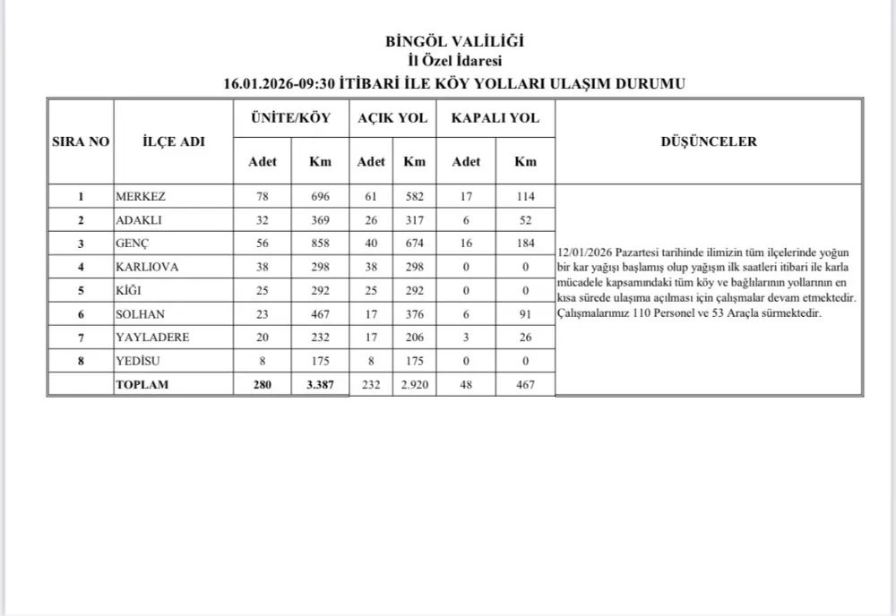 Bingöl'de etkili olan kar yağışı sonrası yüzlerce köy yolu ulaşıma kapanmıştı. İl Özel İdaresi, 110 personel ve 53 araç ile çalışmalarını aralıksız sürdürüyor. Çalışmalar çerçevesinde 280 köy yolundan 232’si ulaşıma açılırken, 48 köy yolunda ise çalışmaların sürdüğü bildirildi.