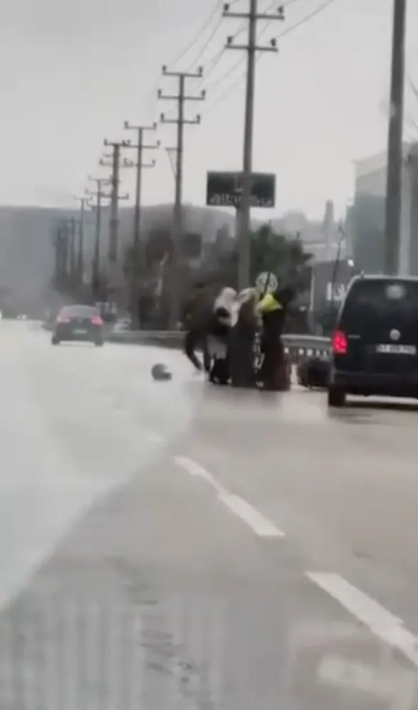 Bursa Kestel’de seyir halindeki sürücü ile motokurye arasında çıkan tartışma, tekme ve yumrukların havada uçtuğu kavgaya dönüştü. O anlar güvenlik kamerasına yansıdı, çevredeki kadınlar olayı ayırmak için çaba gösterdi.