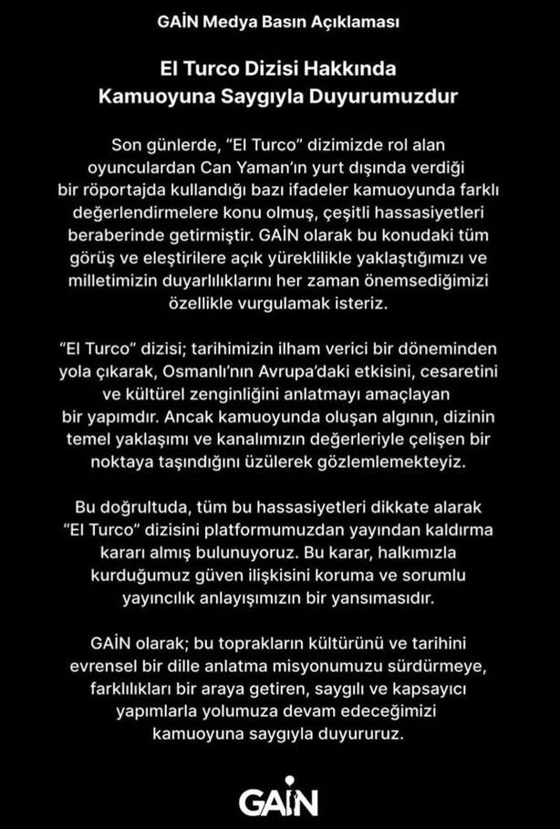 “El Turco”, Osmanlı tarihinin Avrupa’daki etkisini konu edinen ve uluslararası izleyiciye hitap eden bir diziydi. Ancak Can Yaman’ın yurt dışında verdiği bir röportajda sarf ettiği sözler, toplumsal hassasiyetleri zedelediği gerekçesiyle dizinin yayından kaldırılmasına yol açtı. GAİN, resmi açıklamasında, Türkiye’nin kültürel değerlerine saygı ve sorumlu yayıncılık ilkeleri doğrultusunda bu kararı aldığını belirtti. Açıklamada, Yaman’ın sözlerinin dizinin anlatısıyla çeliştiği de vurgulandı.