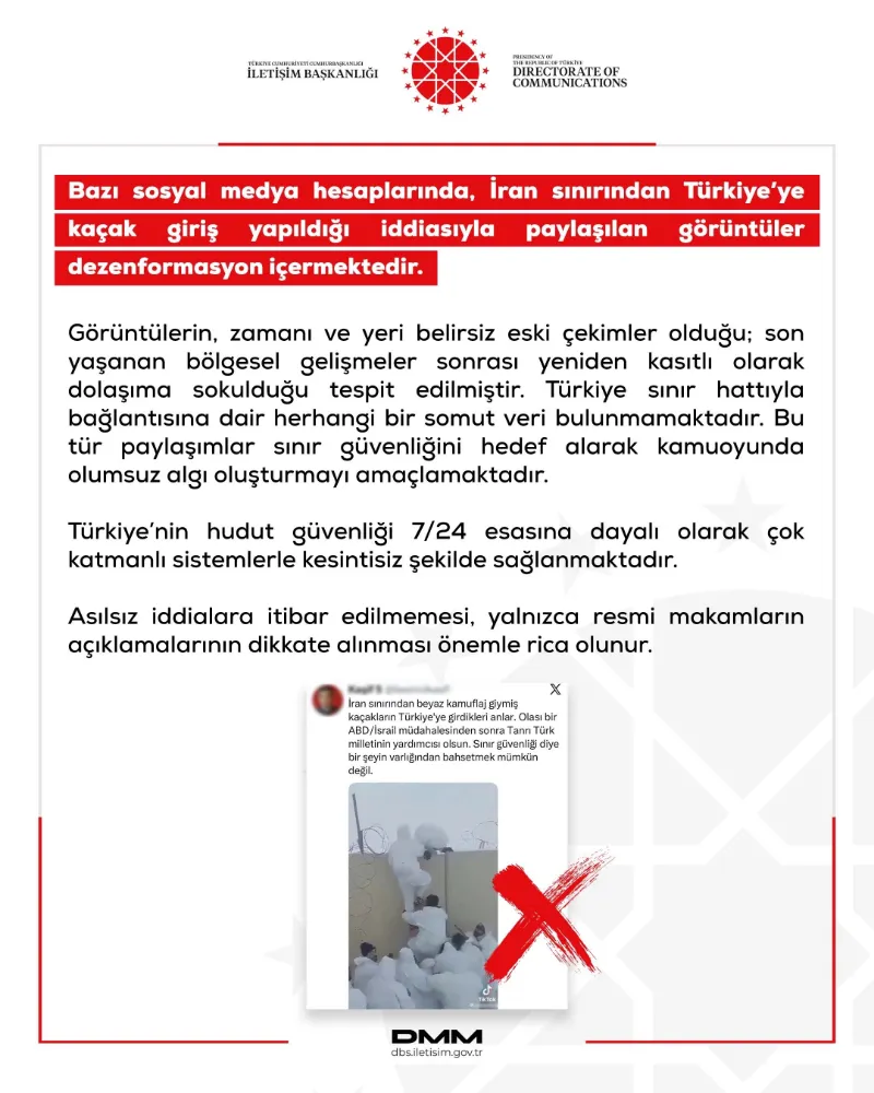 Cumhurbaşkanlığı İletişim Başkanlığı Dezenformasyonla Mücadele Merkezi (DMM) tarafından yapılan açıklamada, "Bazı sosyal medya hesaplarında, İran sınırından Türkiye'ye kaçak giriş yapıldığı iddiasıyla paylaşılan görüntüler dezenformasyon içermektedir" ifadeleri kullanıldı.