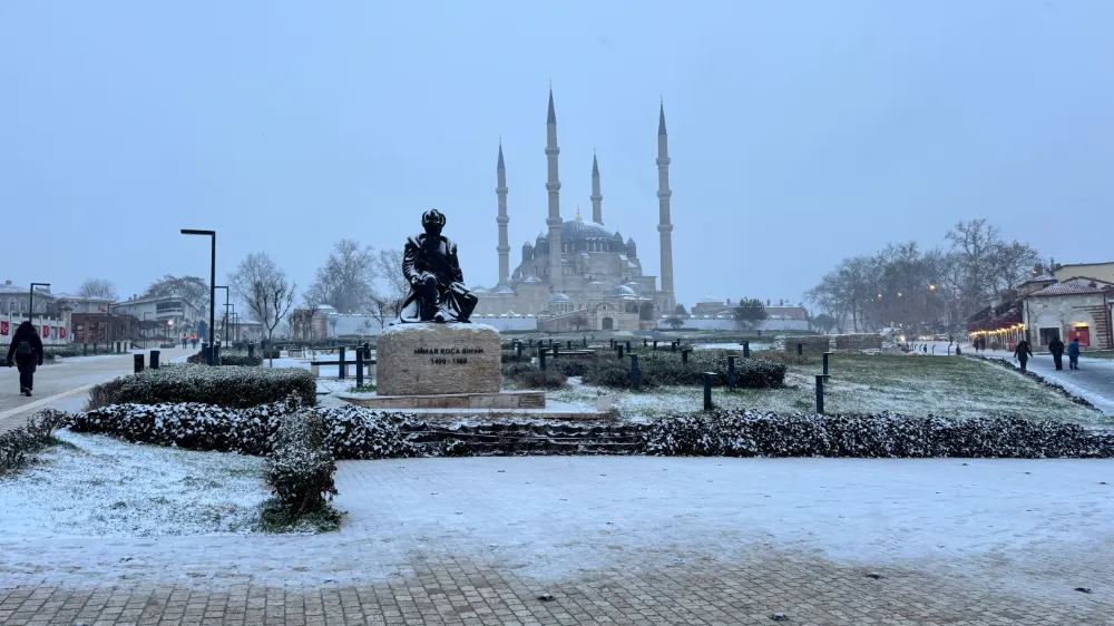 Balkanlar üzerinden gelen soğuk hava dalgasıyla birlikte Edirne’de kar yağışı başladı. Kısa sürede etkisini gösteren yağışla birlikte cadde ve sokaklar beyaza bürünürken, tarihi Selimiye Camii çevresinde kar manzarası mest etti. Yağışın öğle saatlerine kadar yer yer kuvvetli şekilde devam etmesi bekleniyor.