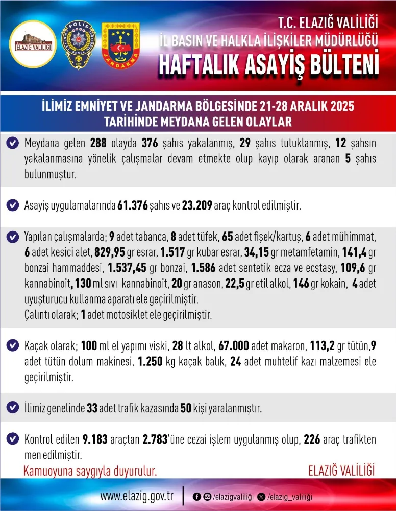 Elazığ Valiliği, 21-28 Aralık 2025 tarihlerini kapsayan haftalık asayiş bültenini yayımladı. Bültende yer alan bilgilere göre, kent genelinde meydana gelen 288 olayda 376 şahıs yakalandı. 29 kişi de tutuklandı. Çalışmalarda 61 bin 376 şahıs ve 23 bin 209 araç denetlendi. Kontrol edilen araçlardan, 2 bin 783’üne cezai işlem uygulanırken 226 araç da trafikten men edildi. Kent genelinde meydana gelen 33 adet trafik kazasında 50 kişinin yaralandı.