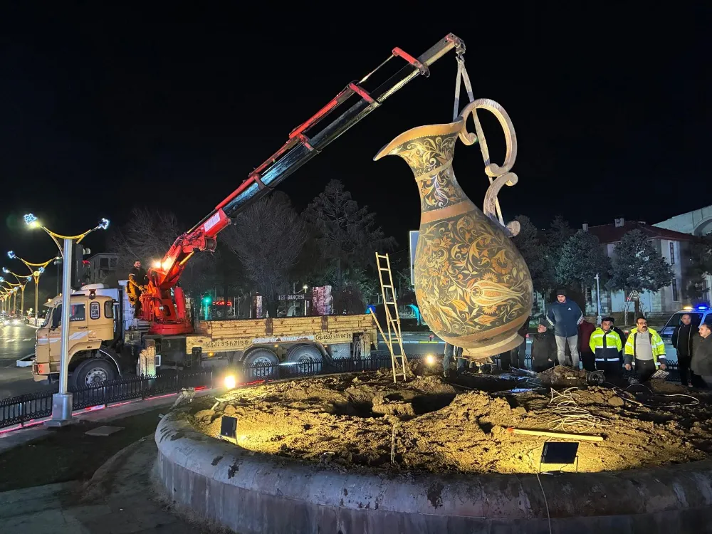 Erzincan’da şehir merkezinin simgelerinden biri olan bakır sürahi, bakım ve onarım çalışmaları kapsamında geçici olarak yerinden kaldırıldı.