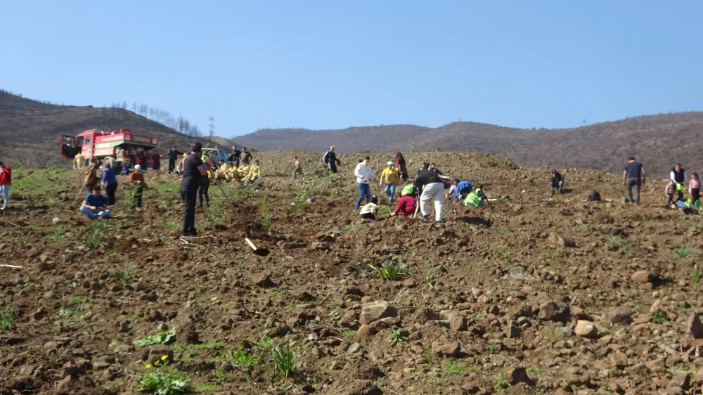 Hatay'da Orman Genel Müdürlüğü ile doğaseverlerin işbirliğinde orman yangınından dolayı yanan alanları canlandırmak için düzenlenen etkinlikte 5 bin fidan toprakla buluşturuldu.