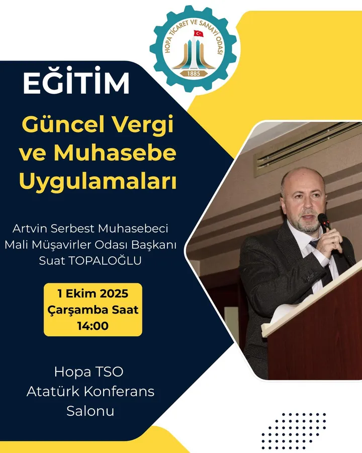 Hopa Ticaret ve Sanayi Odası (TSO), üyelerinin bilgi ve yetkinliklerini artırmak amacıyla düzenlenen eğitim programlarına bir yenisini ekliyor. Oda tarafından yapılan açıklamada, “Güncel Vergi ve Muhasebe Uygulamaları Eğitimi”nin 1 Ekim 2025 Çarşamba günü Atatürk Konferans Salonu’nda gerçekleştirileceği duyuruldu.