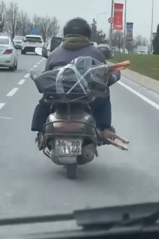 İstanbul Bakırköy'de bir motosiklet sürücüsü, gıda terörüne imza attı. Kesilerek satışa hazırlanan iki küçükbaş hayvanı, streç filmle kaplayarak taşıyan motosiklet sürücüsü, çevredeki bir vatandaşın cep telefonu kamerasına yakalandı.