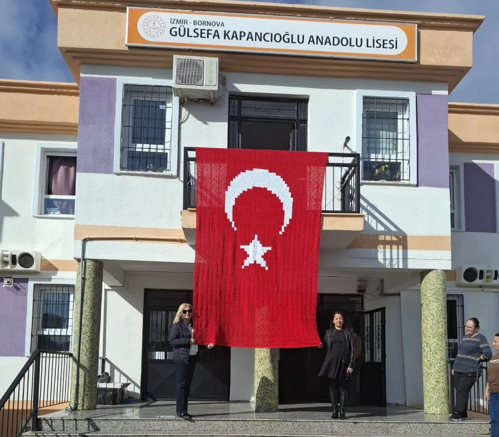 İzmir’in Bornova ilçesinde bulunan Gülsefa Kapancıoğlu Anadolu Lisesi’nde başlatılan ve büyük ses getiren "Türk Bayrağı Örüyoruz" projesi gurur dolu bir finalle tamamlandı. Öğretmen, öğrenci ve velilerin haftalar süren emeğiyle ilmek ilmek dokunan dev Türk Bayrağı, okul binasına asılarak dalgalandırıldı.