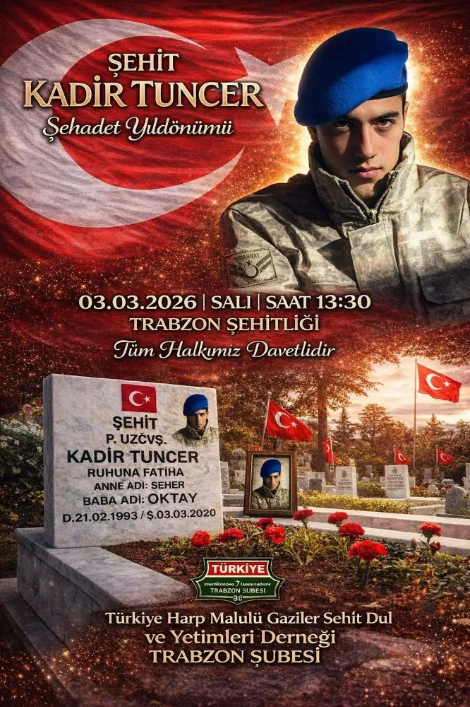 21 Şubat 1993 doğumlu olan Şehit Kadir Tuncer’in 6. yıl dönümünde gerçekleştirilecek anma programına ailesi, yakınları, gaziler ve çok sayıda vatandaşın katılması bekleniyor. Trabzon Şehitliği’nde yapılacak törende, şehidin aziz hatırası kabri başında yad edilecek.