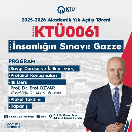 Tören kapsamında “İnsanlığın Sınavı: Gazze” konulu özel bir ders sunumu da yapıldı. Ders, KTÜ Ders Kodu KTÜ0061 ile kayıtlı olup, insan hakları, uluslararası krizler ve Gazze’de yaşanan insani durumlar üzerine kapsamlı bir bakış açısı sundu. Öğrenciler ve akademisyenler, ders kapsamında Gazze’deki insani krizlerin etkilerini detaylı bir şekilde tartışma fırsatı buldu.