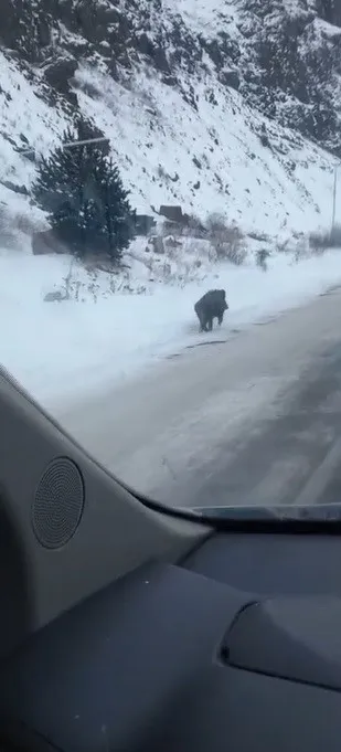 Kars-Ardahan-Göle-Balçeşme kara yolu üzerinde seyir halindeki sürücü, yol kenarında beklenmedik misafirlerle karşılaştı. Ağır kış şartlarının hüküm sürdüğü bölgede, aç kalan yaban domuzu yiyecek aramak için yerleşim yerlerine yakın noktalara kadar geldi. Tek başına yürüyen domuz, daha sonra geri dönerek dağlık alana yöneldi. O anlar araç sürücüsü Vedat Demiral'ın cep telefonuyla kaydedildi. Görüntüde, yol kenarında ilerleyen, daha sonra geri dönerek dağa çıkan domuzun rahat hareketleri yer alıyor.