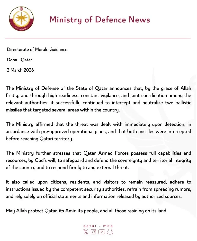 Katar, İran kaynaklı saldırılarda 2 balistik füzenin daha topraklarına ulaşmadan etkisiz hâle getirildiğini; toplamda 98 balistik füze, 3 seyir füzesi, 24 İHA ve 2 savaş uçağının engellendiğini açıkladı.