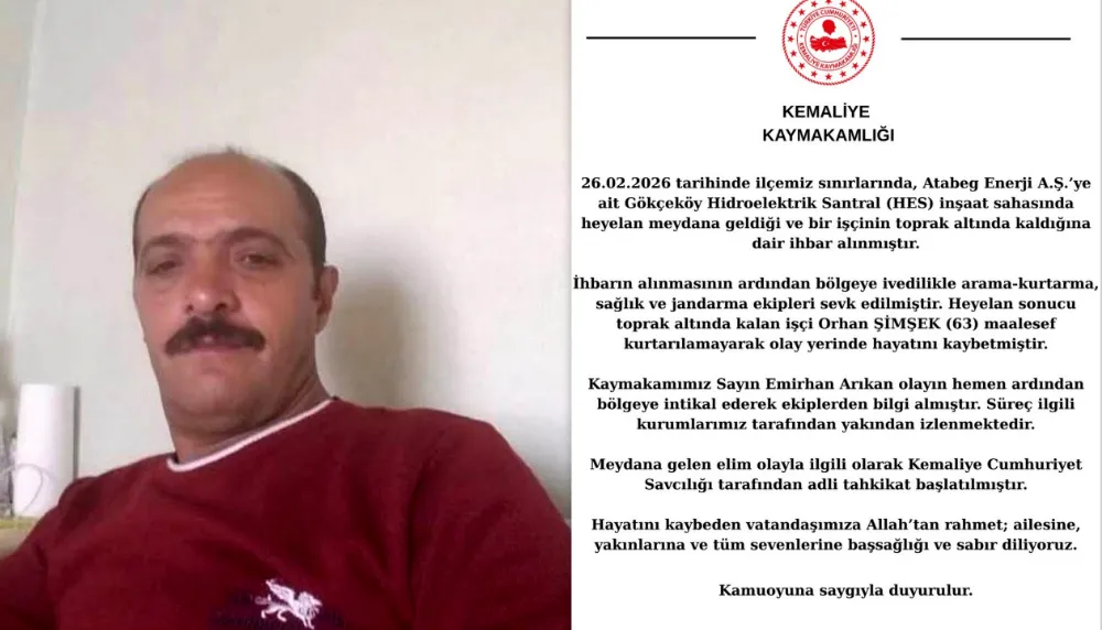 Açıklamada, Kemaliye ilçesinde, Atabeg Enerji A.Ş.’ye ait Gökçeköy Hidroelektrik Santral (HES) inşaat sahasında heyelan meydana geldiği ve bir işçinin toprak altında kaldığı yönünde ihbar alındığı belirtildi.