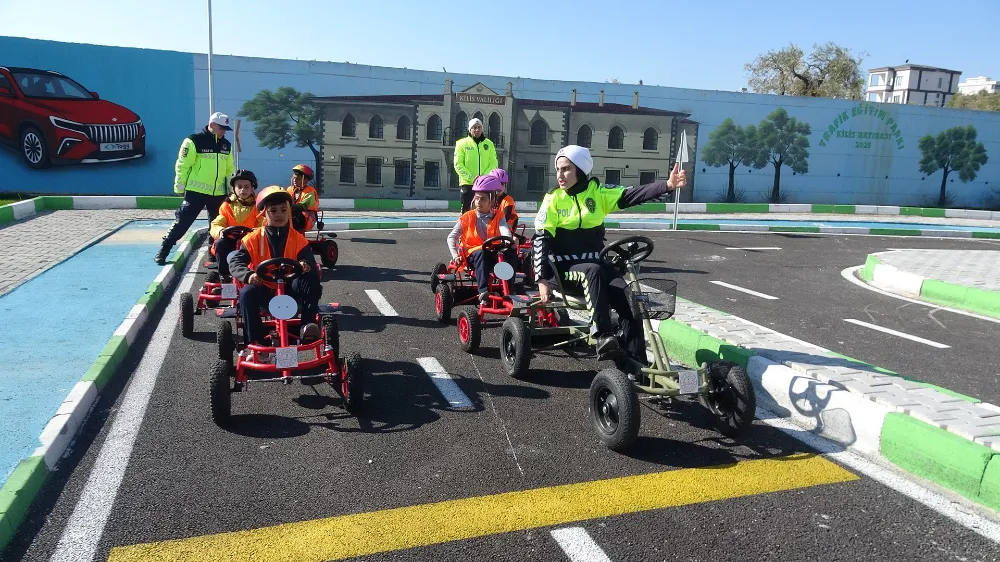 Kilis’te Çocuk Trafik Eğitim Parkı’nda eğitim alan öğrenciler, teorik bilgilerin ardından direksiyon başına geçerek uygulamalı eğitim aldı.