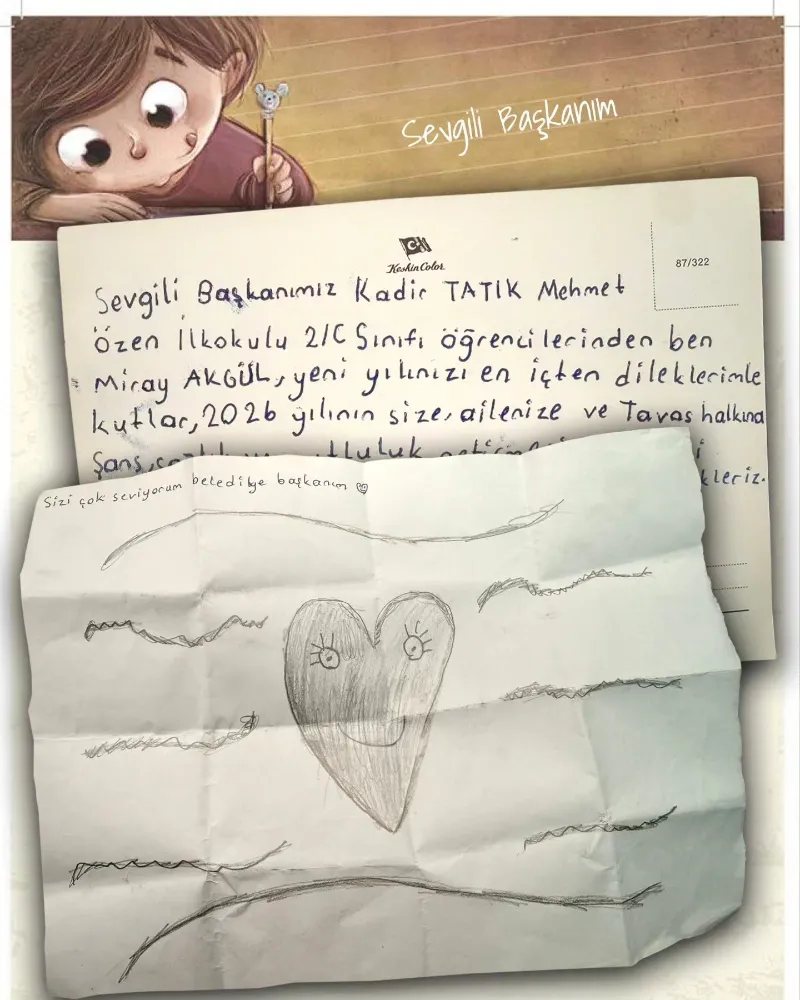 Küçük Miray Akgül mektubunda, "Sevgi Başkanımız Kadir Tatık; Mehmet Özen İlkokulu 2/C sınıfı öğrencilerinden ben Miray Akgül. Yeni yılınızı en içten dileklerimle kutlar, 2026 yılının size, ailenize ve Tavas halkına şans, sağlık ve mutluluk getirmesini temenni ederim. Sınıfımıza en kısa zamanda sizleri bekleriz" ifadelerine yer verdi.