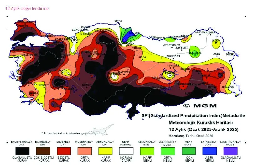 Meteoroloji Genel Müdürlüğü (MGM) tarafından SPI (Standartlaştırılmış Yağış İndeksi) yöntemiyle hazırlanan ve Ocak 2025–Aralık 2025 dönemini kapsayan 12 aylık kuraklık haritası, Trabzon, Rize ve Artvin hattının ülkenin büyük bölümünden ayrıştığını ortaya koydu.