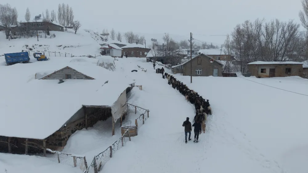 Yoğun kar ve tipi nedeniyle mahsur kalan keçi sürüsü, besicilerin büyük çabasıyla 6 kilometrelik zorlu parkuru aşarak köye getirildi. Hayvanlar, kar üzerindeki yemliklerde beslenmeye devam ediyor.