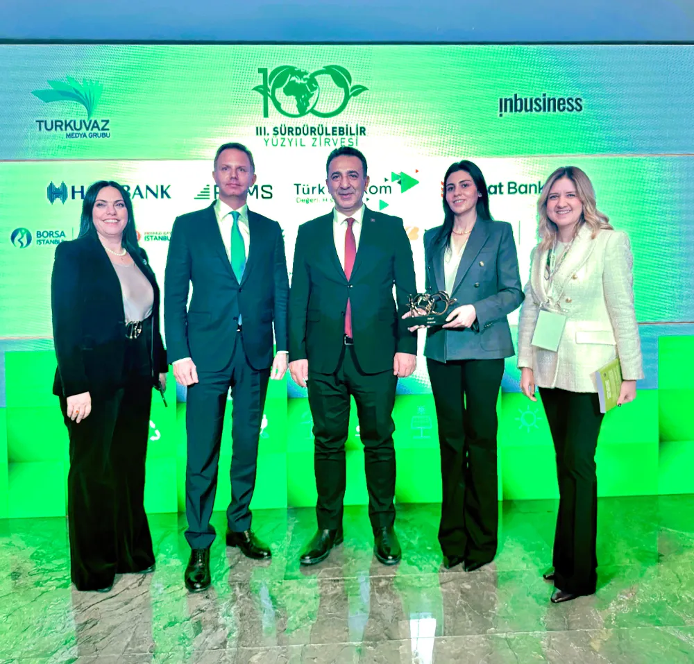 Sürdürülebilirlik alanında iyi uygulamalar geliştiren, dönüşüme öncülük eden kurum ve liderlerin değerlendirildiği ödüller, III. Sürdürülebilir Yüzyıl Zirvesi kapsamında düzenlenen törende sahiplerini buldu. Törende ödül, T.C. Çevre, Şehircilik ve İklim Değişikliği Bakanlığı İklim Değişikliği Başkanı Prof. Dr. Halil Hasar tarafından RE&UP Büyüme ve Stratejiden Sorumlu Direktörü Engin Mete ile Büyüme ve Stratejiden Sorumlu Kıdemli Yöneticisi Gözde Konukoğlu’na takdim edildi.