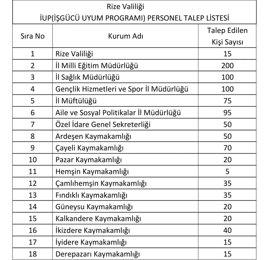 Rize'de İUP kapsamında Rize Valiliği bünyesinde ki kurumlara 920 kişi alınacak.