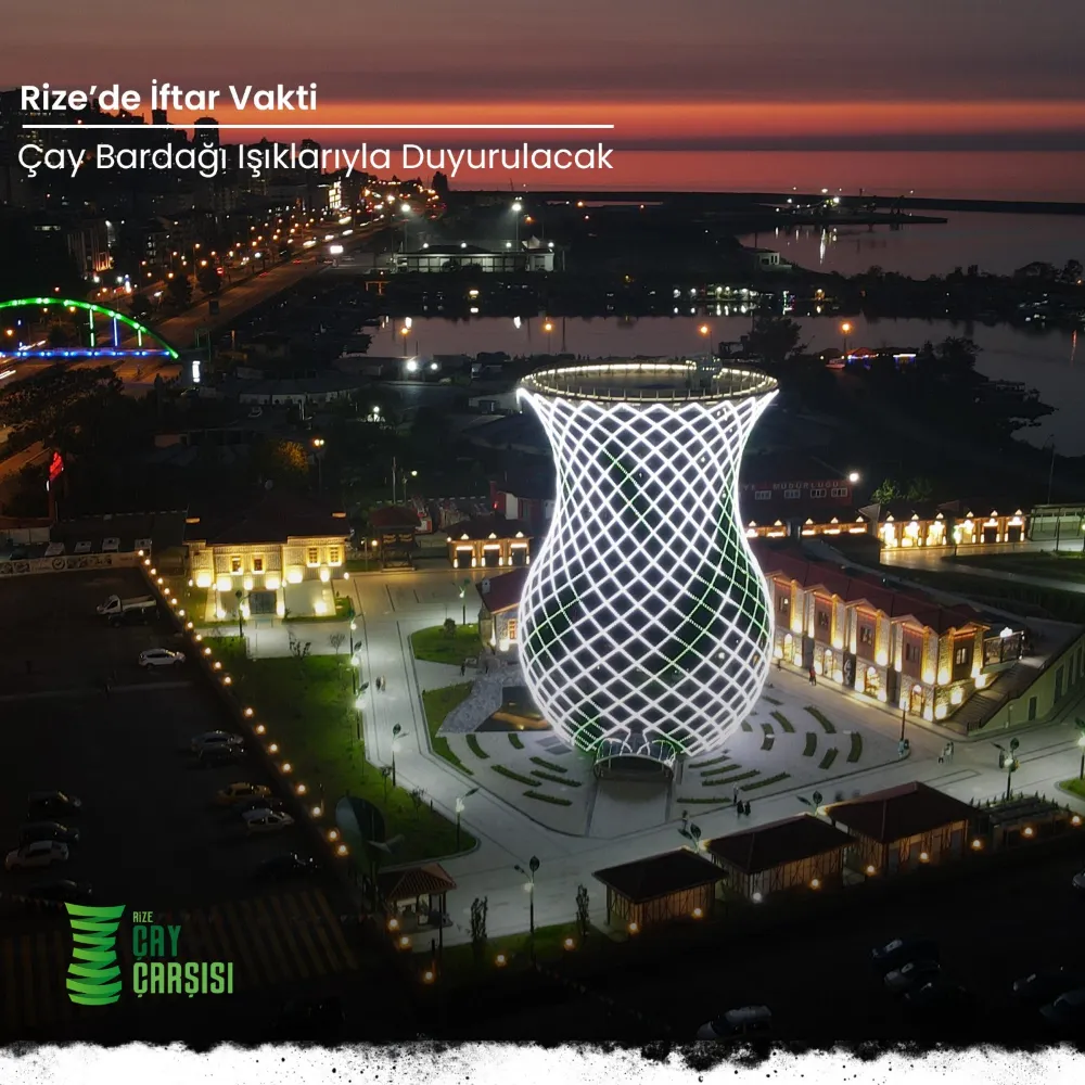 Rize’nin simgelerinden biri haline gelen çay bardağı, iftar zamanı ezan saatiyle eş zamanlı aydınlatılacak.