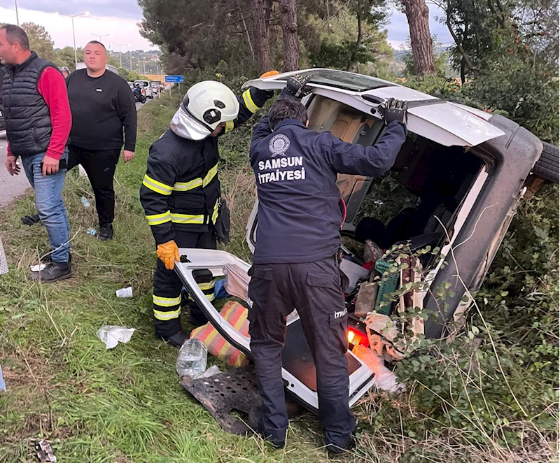 Canan C'nin (29) kullandığı 55 EK 058 plakalı hafif ticari araç, Samsun-Sinop kara yolu Karaköy Mahallesi mevkisinde köpeğe çarpmamak için manevra yapılınca hendeğe devrildi.