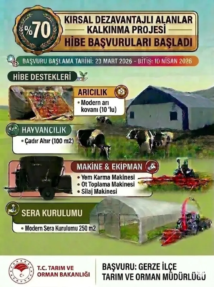 Kırsal Dezavantajlı Alanlar Kalkınma Projesi kapsamında Sinoplu üreticiler, tarım ve hayvancılık ekipmanları için yüzde 70 hibe desteği alabilecek. Başvurular 23 Mart-10 Nisan 2026 tarihleri arasında yapılacak.