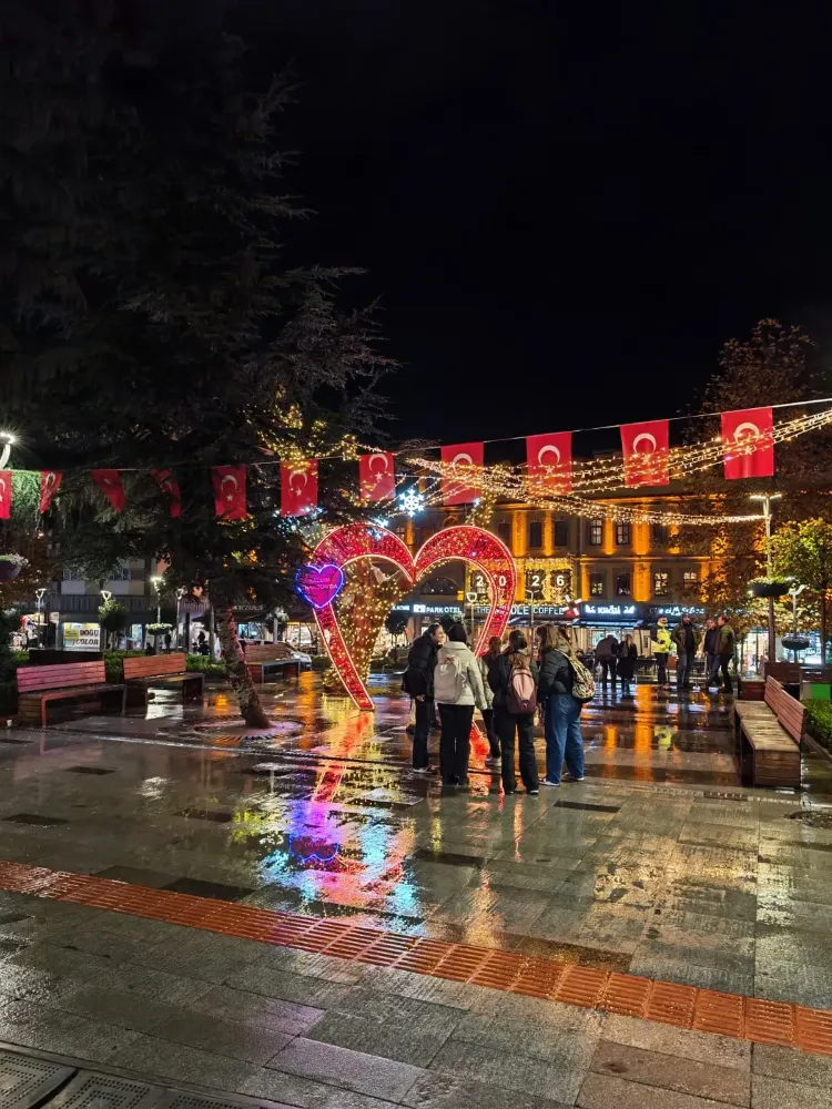 Trabzon Büyükşehir Belediyesi, Meydan Parkı’na küçük ama etkileyici bir dokunuş yaptı. Parkın hemen kenarına, arkada tarihi binaları da kapsayacak şekilde büyük ve ışıklandırılmış bir kalp figürü yerleştirildi.