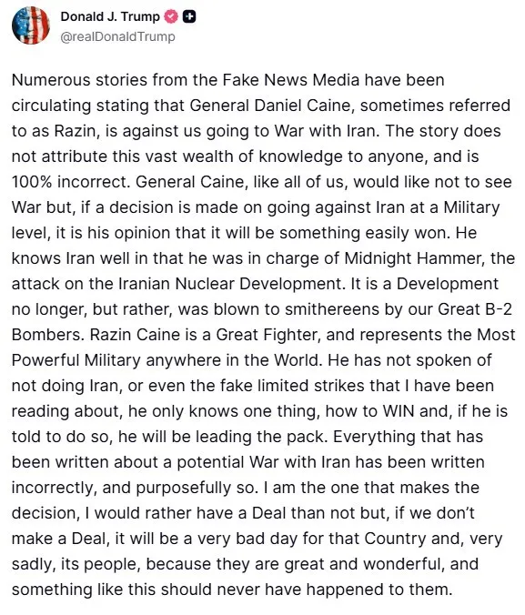 "Razin" olarak da bilinen General Caine’in "harika bir savaşçı olduğunu" ve "dünyanın en güçlü ordusunu temsil ettiğini" kaydeden Trump, "O, İran'a saldırmamaktan ya da basından okuduğum sahte kapsamı sınırlı saldırılardan bahsetmedi. O sadece kazanmayı bilir ve eğer kendisine söylenirse, buna önderlik edecektir" ifadelerini kullandı. İran ile muhtemel savaş senaryolarını ele alan haberlerin gerçeği yansıtmadığını ve kasıtlı olarak yanlış yazıldığını savunan Trump, "Kararı veren kişi benim. Ben bir anlaşma olmasını, olmamasına tercih ederim. Ancak bir anlaşmaya varamazsak, bu İran ve ne yazık ki halkı için çok kötü bir gün olur. Çünkü İran’ın halkı harika ve iyi insanlar ve böyle bir şeyin onların başına asla gelmemesi gerekir" dedi.
