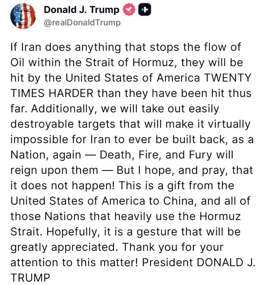 ABD Başkanı Donald Trump, "İran, Hürmüz Boğazı'ndaki petrol akışını durduracak herhangi bir şey yaparsa, ABD tarafından bugüne kadar aldığı darbelerden yirmi kat daha sert bir şekilde vurulacaktır" açıklamasında bulundu.