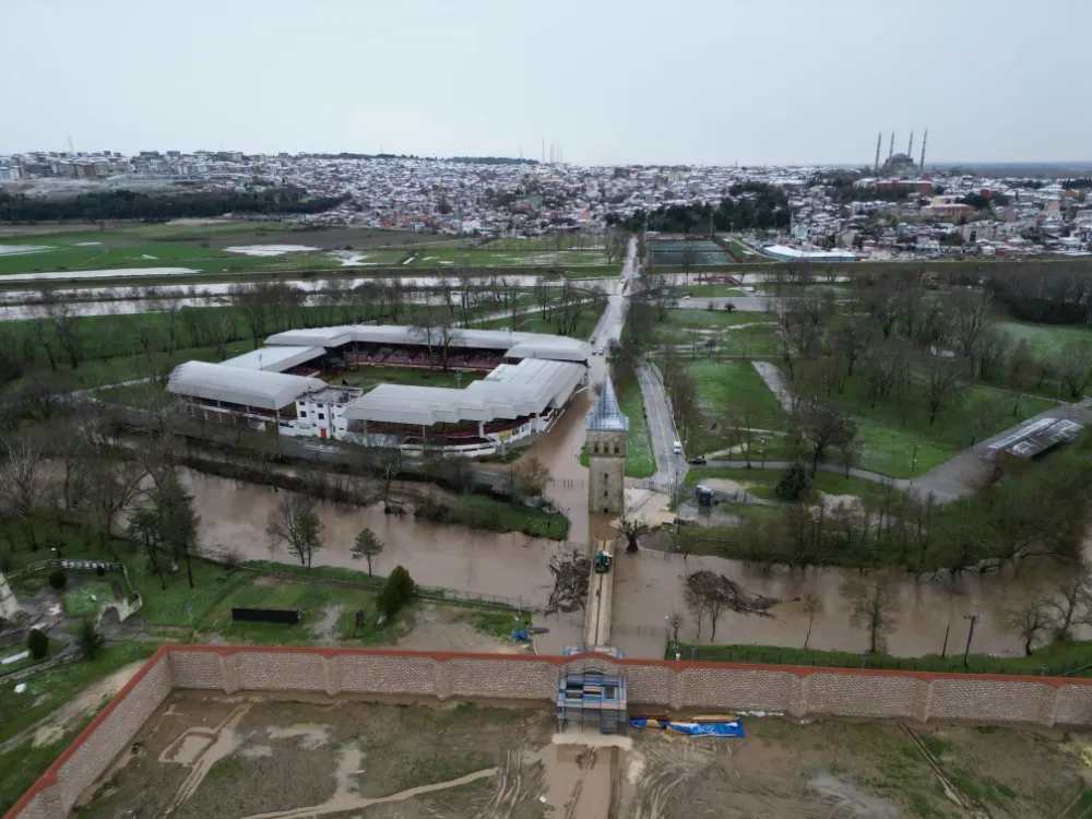 Taşkının en çok etkilediği nokta olan Sarayiçi’nde, tarihi Er Meydanı’nın girişleri, pehlivan heykellerinin bulunduğu meydan ve sosyal alanlar tamamen suyla kaplandı. Nehir üzerindeki tarihi köprülerin kemer seviyelerine kadar yükselen su, bölgedeki bankları ve ağaçları da yuttu.