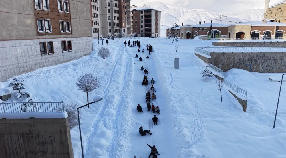 İlçe merkezinde üç gün boyunca etkili olan ve ulaşımda aksamalara neden olan kar yağışı, yerini güneşli havaya bıraktı. Yağışı eğlenceye dönüştüren çocuklar, Cumhuriyet Mahallesi'ndeki yokuşlu yollarda bir araya geldi. Kendi imkanlarıyla oluşturdukları pistte sıraya giren çocuklar; poşet, tahta, tepsi ve bidon gibi malzemeleri kızak olarak kullanarak gönüllerince eğlendi. Ailelerin de evlerinin pencerelerinden takip ettiği o anlarda renkli görüntüler oluştu.