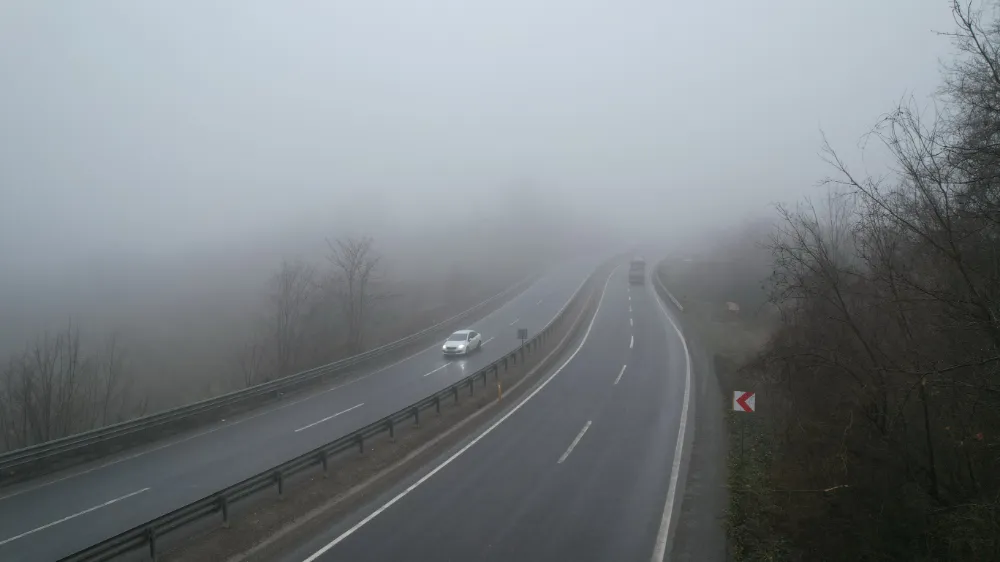 Karayolunun ve çevresini kaplayan yoğun sis tabakası, dron ile havadan görüntülendi.