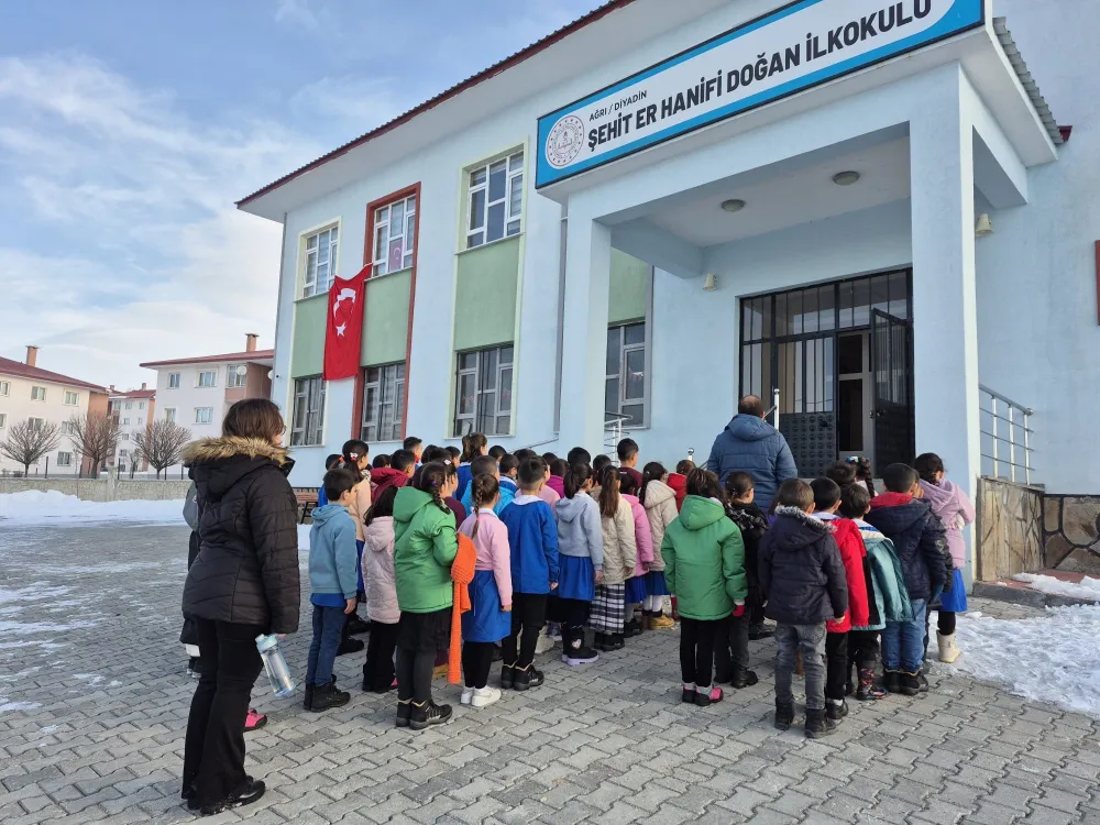 Kahramanmaraş merkezli 6 Şubat depremlerinin üçüncü yıl dönümünde Ağrı genelindeki okullarda ilk ders öncesinde bir dakikalık saygı duruşu yapıldı.