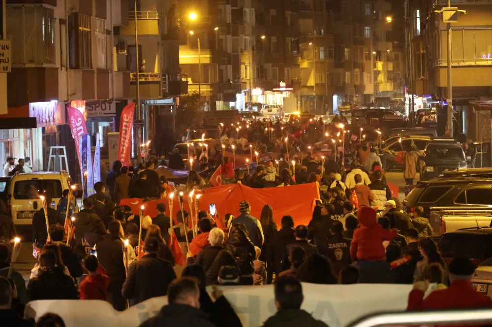 Fener alayı yürüyüşü, Atatürk anıtı önünde başladı. İlçe Kaymakamı Burak Çimşir, Belediye Başkanı Turgay Ataselim, İlçe Jandarma Komutanı Ali Büyükkeskin, İlçe Emniyet Müdürü Bünyamin Temur ve siyasi parti temsilcilerinin yanı sıra, genç yaşlı birçok vatandaş da etkinliğe katıldı.