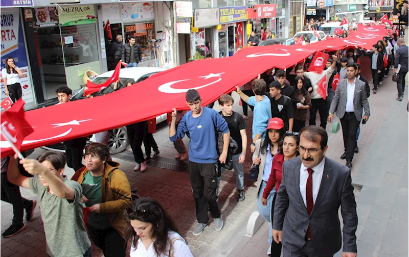 Cumhuriyet ve İnönü caddeleri güzergahında yapılan yürüyüşte öğrenciler, 50 metre uzunluğundaki Türk bayrağını taşıdı.