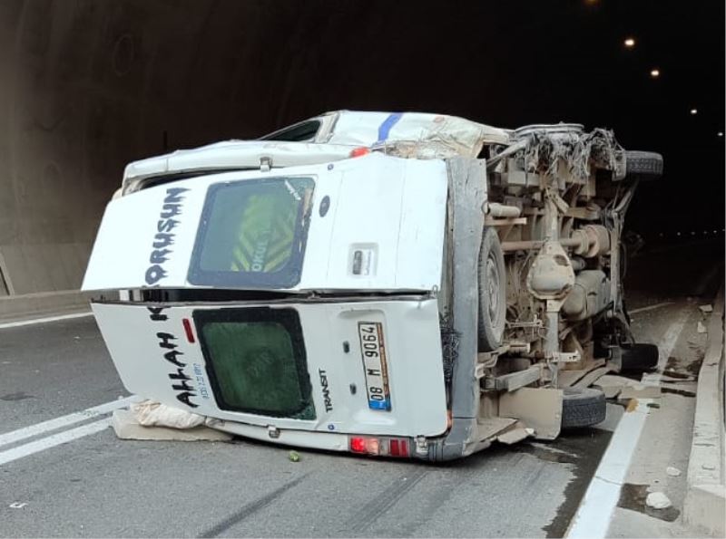 Alınan bilgiye göre, ilçeye bağlı Irmakyanı köyü Serindere mevkisi T-17 tüneli girişinde Mehmet Avarisli'nin (56) kullandığı 08 M 9064 plakalı minibüs lastiğinin patlaması sonucu devrildi.