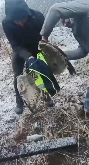 Ardanuç ilçesinde İl Özel İdaresi ekipleri, yol güzergâhında seyir halindeyken tellere takılarak çırpınan bir baykuşu fark etti. Ekipler, aracı güvenli şekilde durdurarak baykuşu kurtarmak için çalışma başlattı.