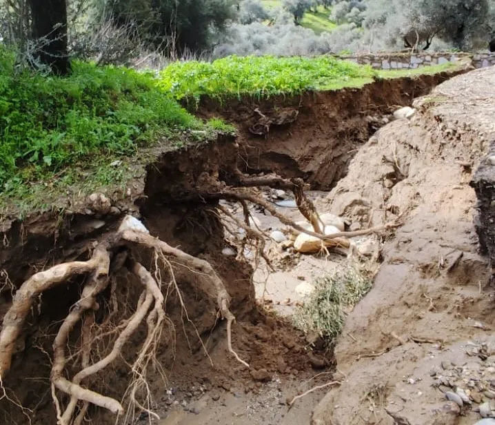 Aydın'ın Efeler ilçesi İlyasdere Mahallesi'nde yoğun yağışlarla birlikte taşan ve yön değiştiren dere, zeytin bahçelerini sular altında bırakırken, toprağın aşınmasıyla birlikte adeta ikinci bir dere yatağı oluştu.