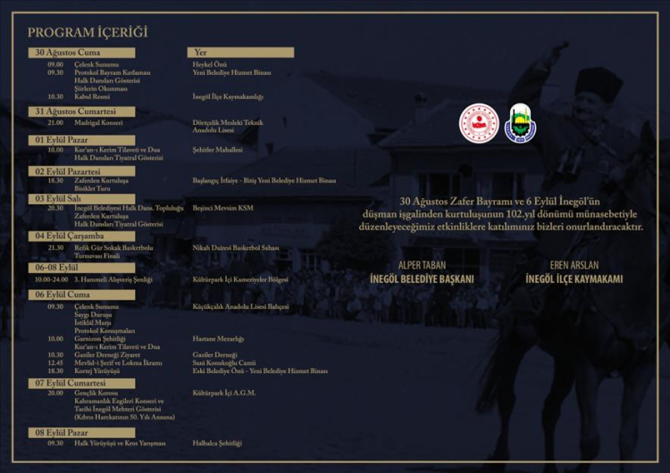 Belediye Başkanı Alper Taban, açıklamasında 30 Ağustos Zafer Bayramı ve akabinde başlayacak olan 6 Eylül İnegöl’ün düşman işgalinden kurtuluşunun 102. Yılı etkinliklerine tüm ilçe halkını davet etti. Taban, “Zaferin ve kurtuluşun coşkusunu tüm ilçe halkımızla birlikte yaşamak istiyoruz. Bizler bu 10 günlük süreçte şehrimizde dolu dolu yaşanacak etkinlikler planladık. Vatandaşlarımızı da bu etkinliklerde görmeyi arzu ediyoruz. Etkinliklerimiz 30 Ağustos Cuma sabahı 09.00’da Zafer Bayramı kutlamaları kapsamında Atatürk Anıtına çelenk sunumuyla başlayacak. Akabinde aynı gün 09.30’da Yeni Belediye Binası önünde halk dansları gösterileri, şiirler okunacak. 10.30’da Kaymakamlık makamında resmi kabul töreni gerçekleştirilecek. 31 Ağustos Cumartesi akşamı ise Dörtçelik EML bahçesinde “Zaferden Kurtuluşa Madrigal Konseri” olacak. 01 Eylül Pazar günü zaferin ardından kurtuluş etkinliklerimiz devam edecek. Pazar günü 10.00’da Şehitler köyü Kurtuluş Savaşı Şehitliği’nde Kuranı Kerim tilaveti ve dualar yapılacak. 02 Eylül Pazartesi 18.30’da itfaiye kavşağından yeni belediye binası önüne kadar Zaferden Kurtuluşa Bisiklet Turu yapılacak. 03 Eylül Salı akşamı 20.30’da Beşinci Mevsim Kültür Merkezimizde İnegöl Belediyesi Halk Dansları Topluluğu “Zaferden Kurtuluşa Halk Dansları Tiyatral Gösterisi” yapılacak. 04 Eylül Çarşamba akşam 21.30’da nikah salonu önündeki basketbol sahasında Refik Gür Sokak Basketbolu Turnuvasının finali yapılacak. 06 Eylül Cuma İnegöl’ün Kurtuluşunun 102. Yıl Dönümü Resmi Törenleri yapılacak. Sabah 09.30’da Küçükçalık Anadolu Lisesi Bahçesinde çelenk töreni, 10.00’da Garnizon Şehitliği ziyareti, 10.30’da Gaziler Derneği ziyareti ve 12.45’te Sani Konukoğlu Camisinde mevlit ile Cuma namazı sonrası lokma ikramları olacak. 18.30’da Sani Konukoğlu Camisinden yeni belediye binası önüne kadar kortej yürüyüşü gerçekleştirilecek ve burada halk dansları gösterileri yapılacak. Yine 06 Eylül Cuma sabah 10.00 itibariyle Kültürpark kameriyeler bölgesinde 3. Hanımeli Alışveriş Şenliğimiz başlayacak. 8 Eylül Pazar akşam 00.00’a kadar açık olacak.  6 Eylül Cuma akşamı 20.00’da yerel ekiplerimizden Oktay Esen’in pop konseri alışveriş şenliği alanında gerçekleştirilecek. 07 Eylül Cumartesi; 20.00’da Amfi Tiyatroda Kıbrıs Harekatının 50. yılı anısına özel bir gece olacak. Gençlik korosu “Kahramanlık Ezgileri” konseri ve Tarihi İnegöl Mehterimizin Gösterisi yer alacak. 08 Eylül Pazar günü de finalde 09.30’da Halhalca Şehitliğinde Kros Yarışması ve Halk Yürüyüşümüz olacak. Bu yıl 3’üncüsü yapılan geleneksel etkinliğimizde, İnegöl’de Kurtuluş Savaşının en çetin mücadelesinin verildiği bölgede o günlerin anısına yürüyeceğiz. Kros ve yürüyüş bitiminde tüm katılımcılara simit ve çay ikramlarımız olacak” diye konuştu.
