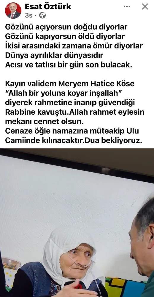 Başkan Öztürk vefat haberini duyurduğu sosyal medya paylaşımında, "Kayınvalidem Hatice Meryem Köse ‘Allah bir yoluna koyar inşallah’ diyerek rahmetine inanıp güvendiği Rabbine kavuştu. Allah rahmet eylesin, mekanı cennet olsun. Cenaze öğle namazına müteakip Ulu Camii’nde kaldırılacaktır. Dua bekliyoruz" ifadelerine yer verdi.
