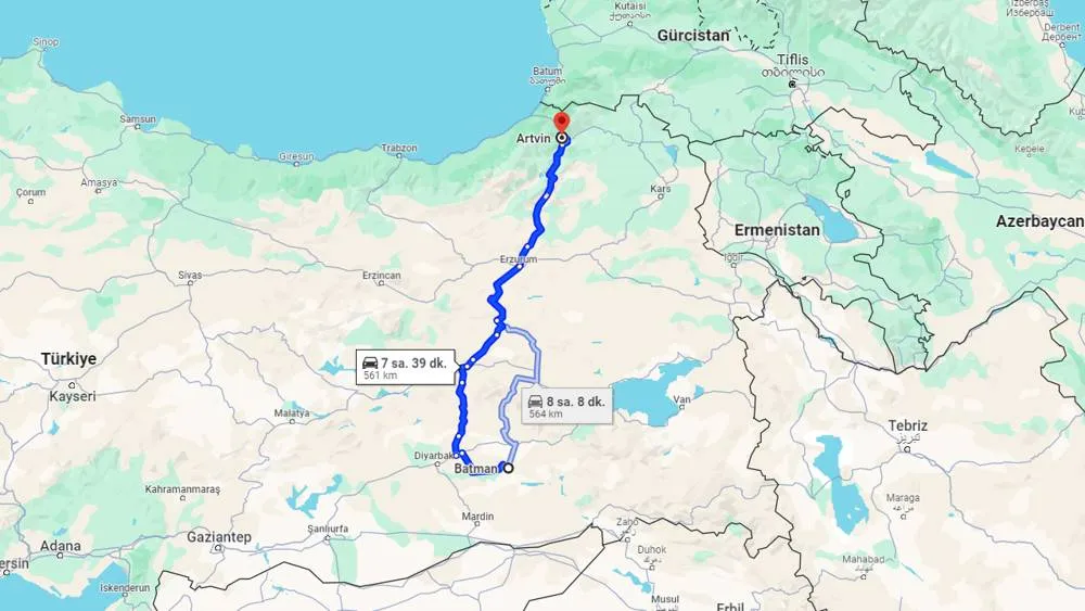 Batman ve Artvin arasındaki karayolu mesafesi yaklaşık 570 kilometredir. Özel araç ile bu mesafeyi kat etmek ortalama 7,5 saat sürer. Yolculuk boyunca keyifli manzaraların tadını çıkarabilirsiniz.
